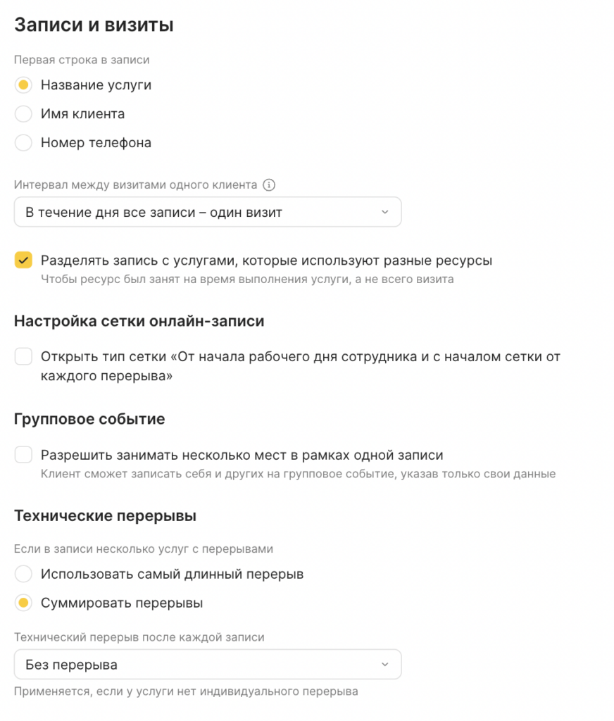 Эта опция позволит клиентам делать запись на групповое событие для себя и друзей или членов семьи без необходимости создавать несколько записей для каждого посетителя.В блоке Технические перерывы выберите, как будет распределяться длительность перерывов, если в записи несколько услуг с перерывами: