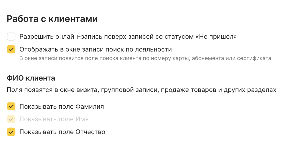 - ФИО клиента – включите дополнительные поля с фамилией и/или отчеством клиента. Подробнее об этой настройке здесь.