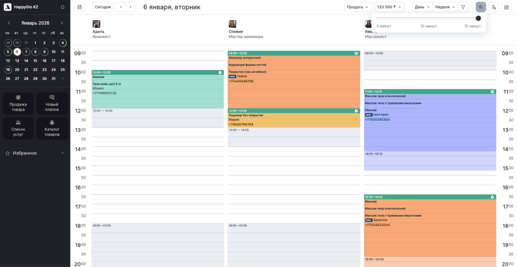На минимальную длительность записи выбранное отображение не влияет — вы всегда сможете создавать записи, услуги и события длительностью от 5 минут.