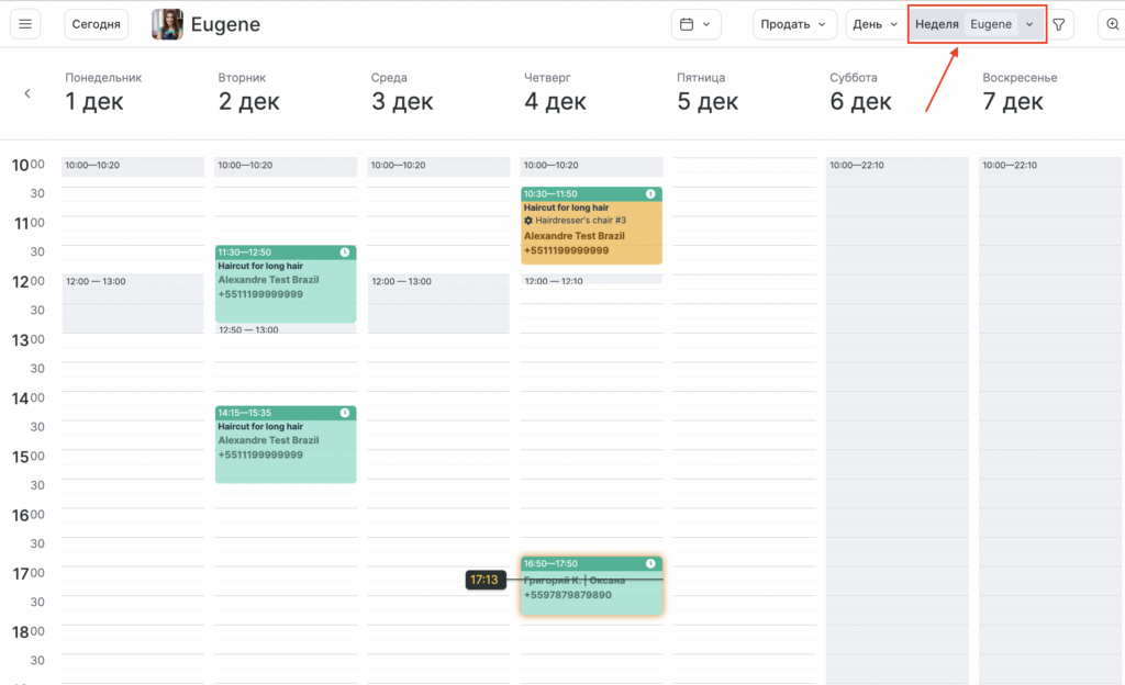 В режиме Неделя можно просматривать расписание на всю неделю только по одному сотруднику или ресурсу.