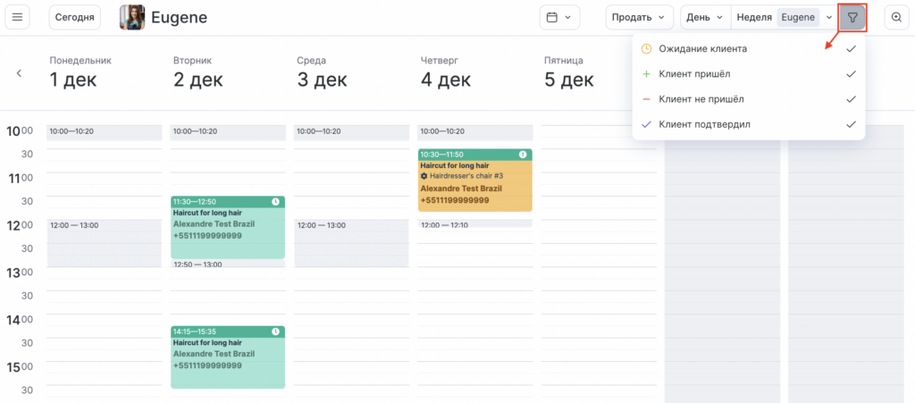 С помощью кнопки фильтрации вы сможете отфильтровать все визиты по их статусам. Например, можно скрыть все визиты со статусом «Клиент не пришел», чтобы они не мешали созданию новых записей в журнале.