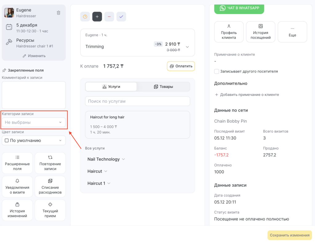 По умолчанию создано 4 категории записей: Полная онлайн-оплата, Частичная онлайн-оплата, Сотрудник важен, Сотрудник неважен.