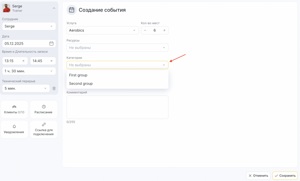 При создании или редактировании события в журнале в окне можно выбрать одну или несколько категорий для события.