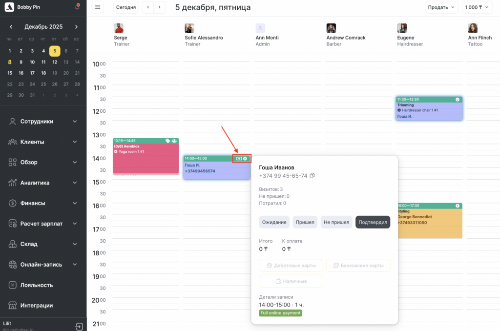 1. Полная онлайн-оплата означает, что клиент заранее полностью оплатил визит с помощью онлайн-оплаты.