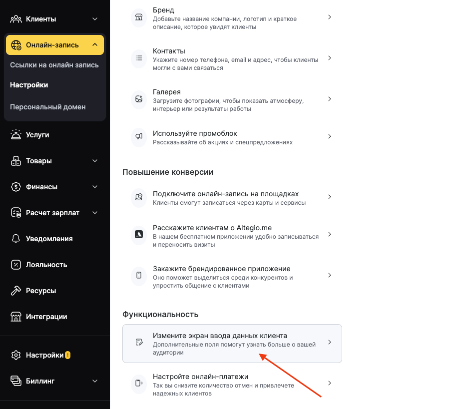 - В режиме Администрирования, в разделе Онлайн-запись > Настройки > Функциональность > Измените экран ввода данных клиента.