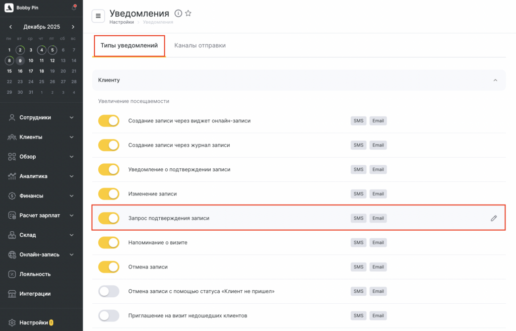 Выберите тип Подтверждение записи клиента, созданной через виджет онлайн-записи: