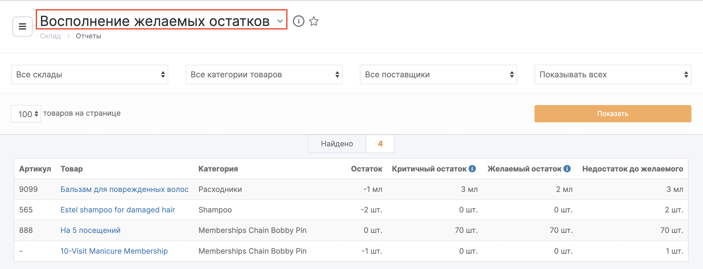 - Желаемый остаток (количество товара, которое должно находиться на складах для достижения тех или иных задач, настраивается в карточке товара, подробнее об этом в статье).