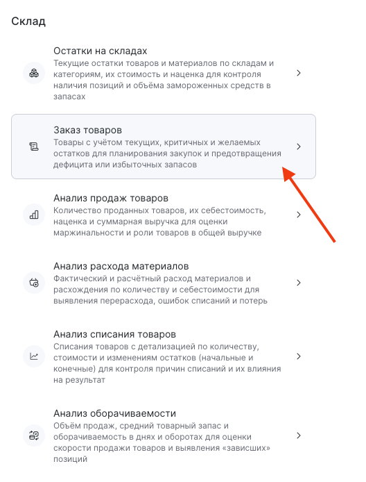 Отчет для восполнения количества товара можно просмотреть в разделе Отчеты > Все отчеты > Склад > Заказ товаров или Товары > Отчеты > Заказ товаров. Он может быть сформирован в различных вариантах в зависимости от того, какую информацию необходимо в нем отразить.