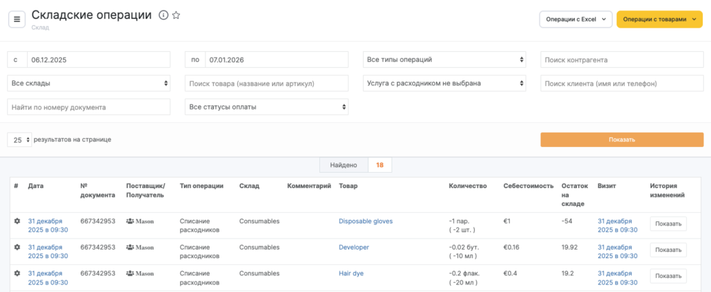 - Вид операций (приход, продажа, списание товара, списание расходника, перемещение между складами).
