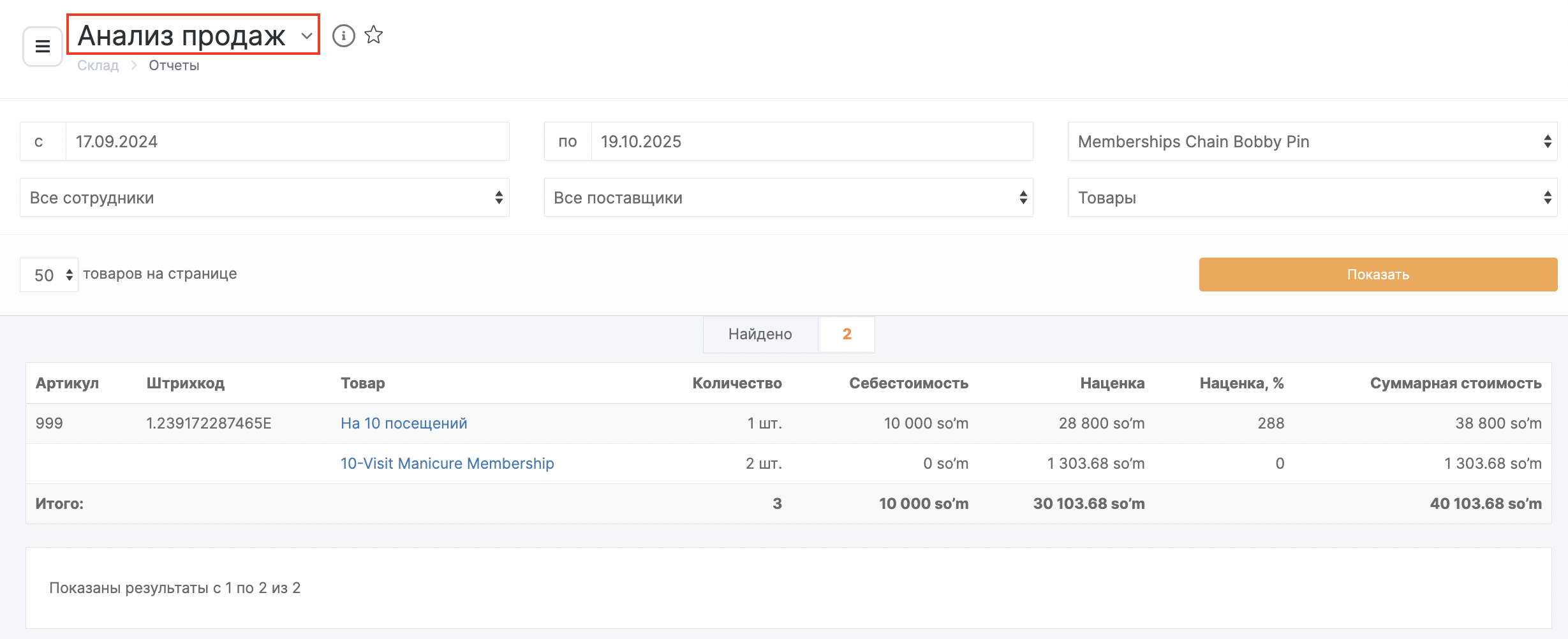 Для формирования отчета перейдите в раздел «Склад» > «Отчеты» > «Анализ продаж». Отфильтруйте список по необходимым пунктам и нажмите кнопку «Показать».