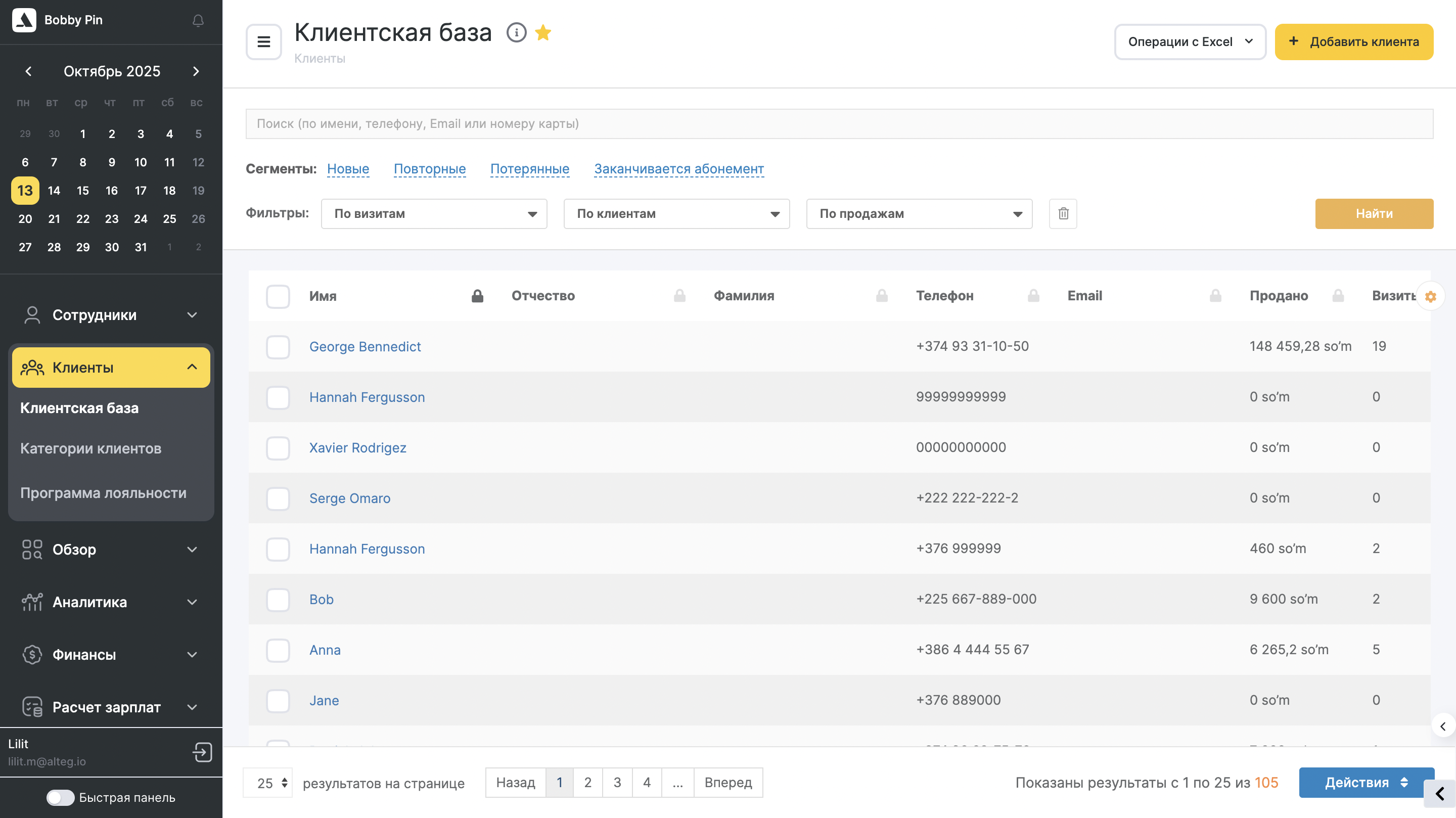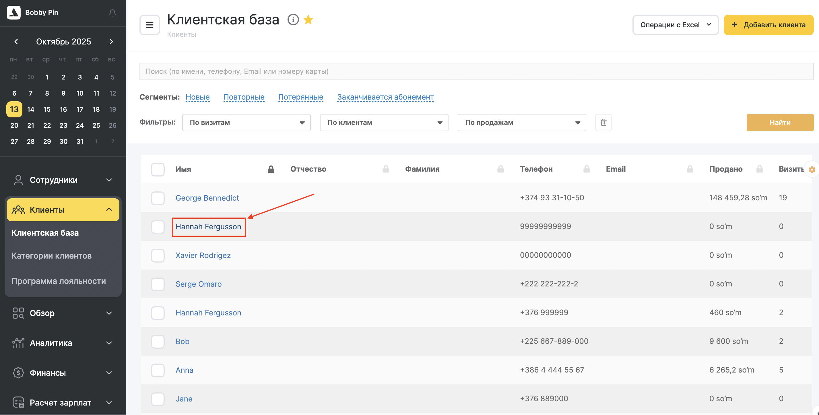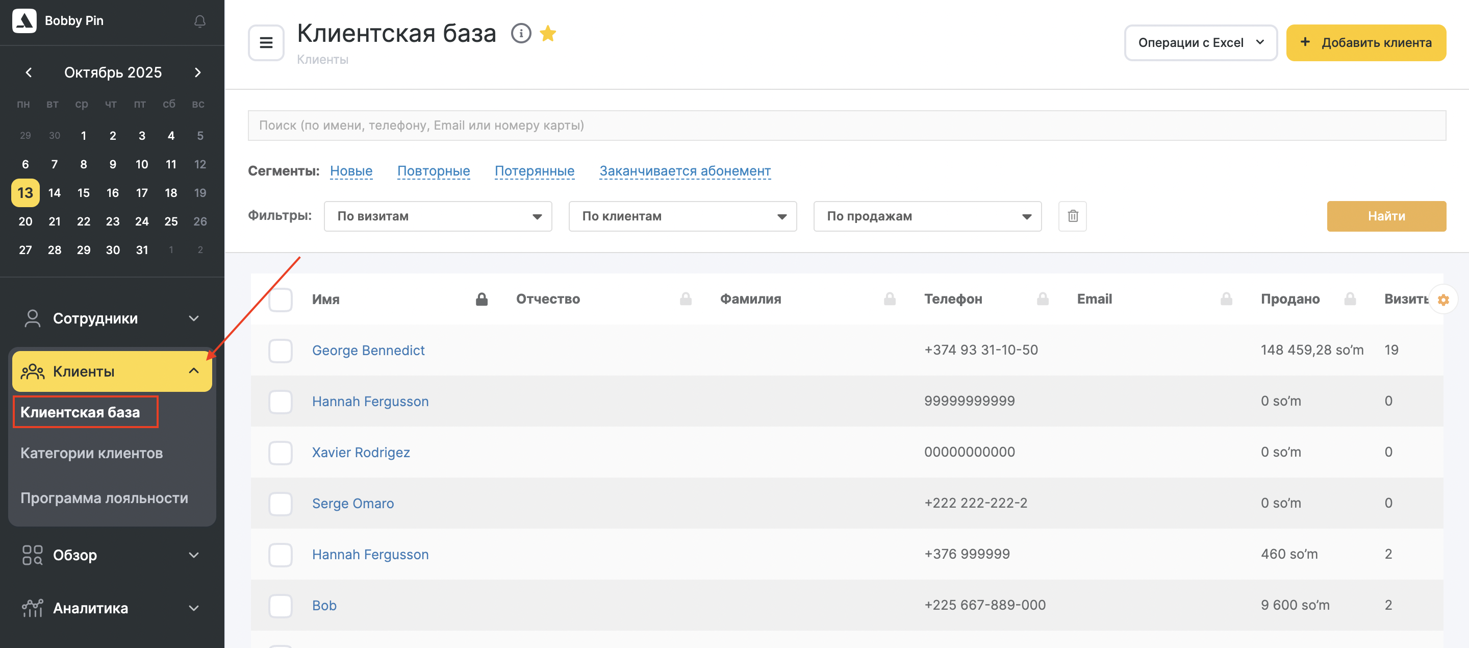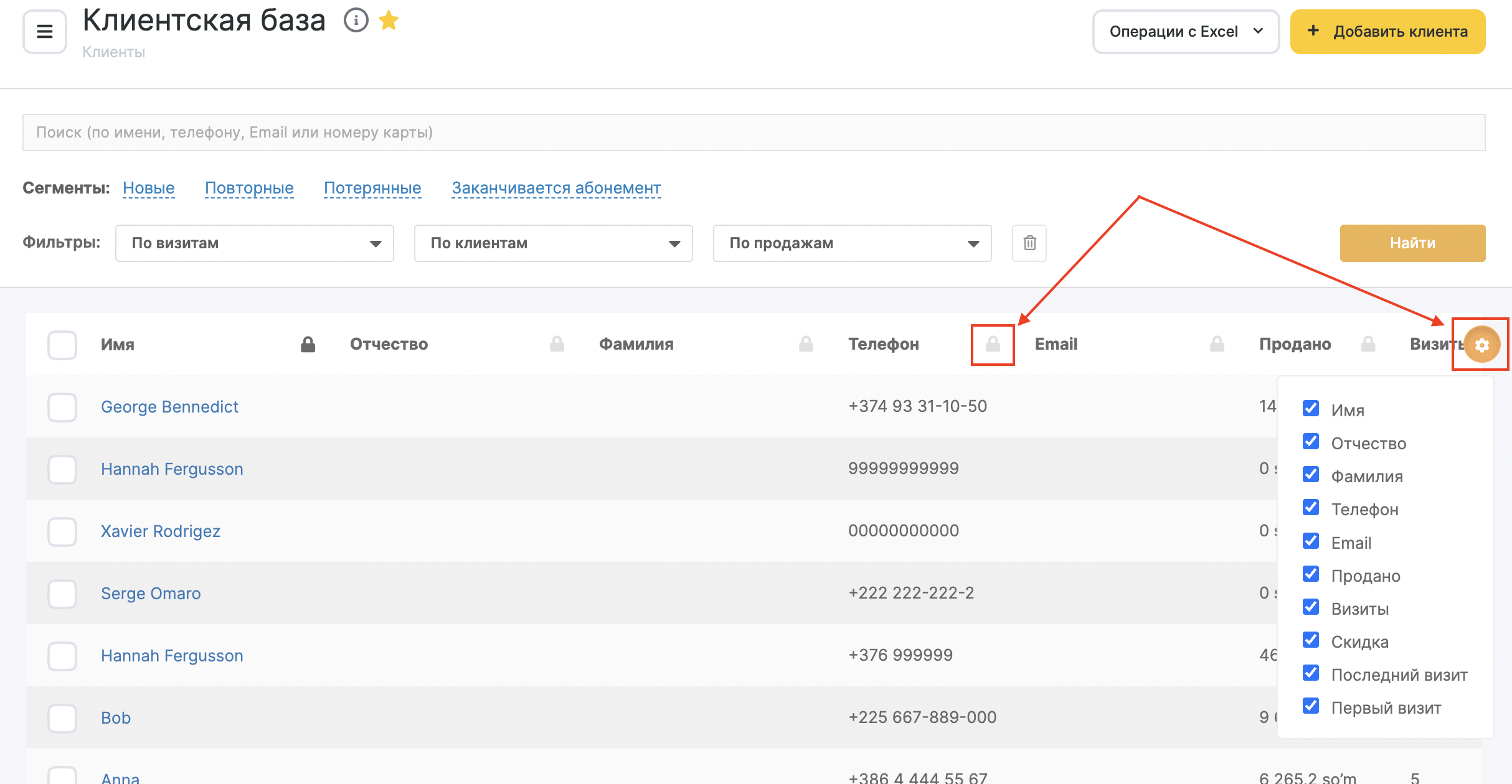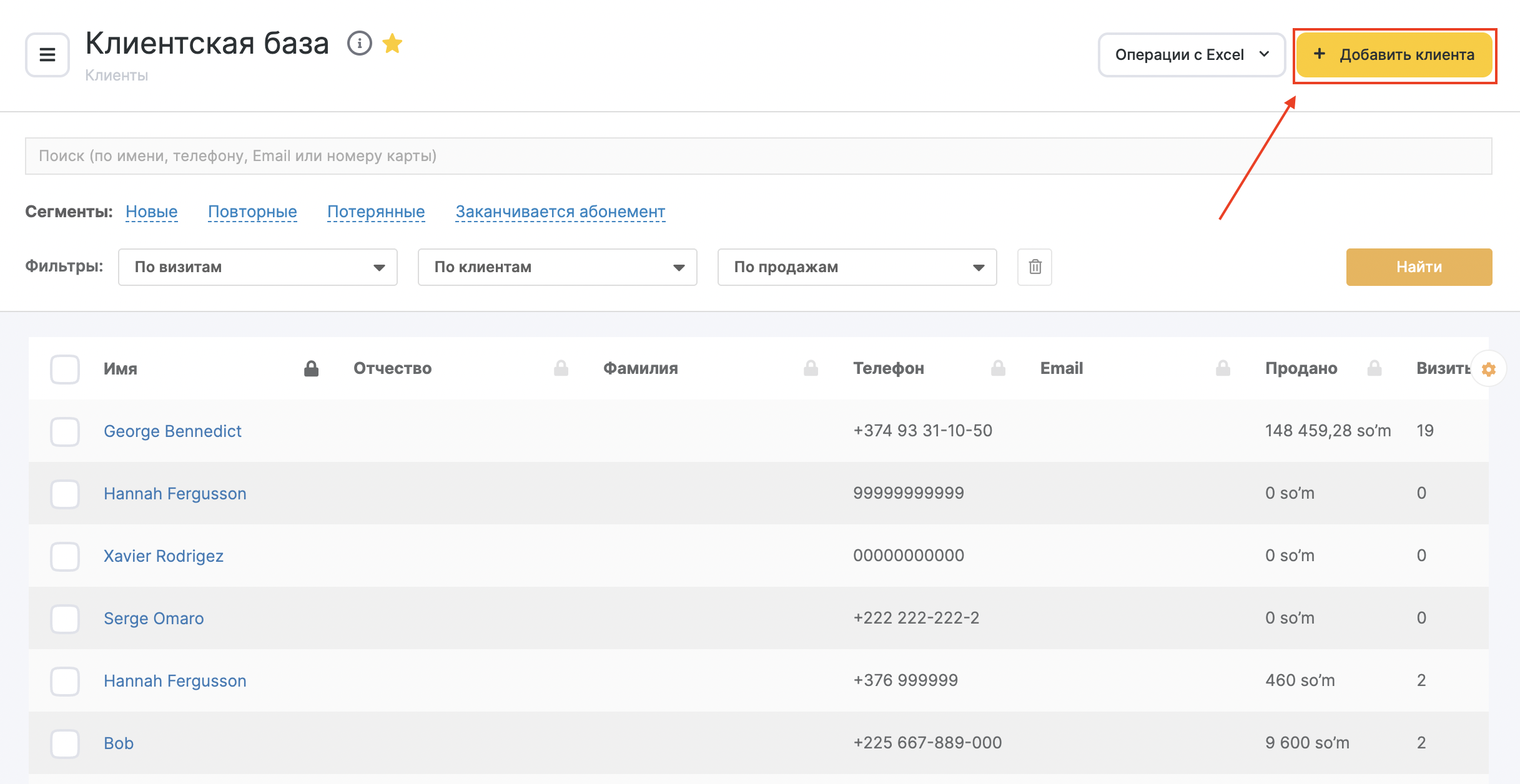 В разделе «Клиенты» > «Клиентская база» отображается информация обо всех клиентах, посещавших вашу компанию.