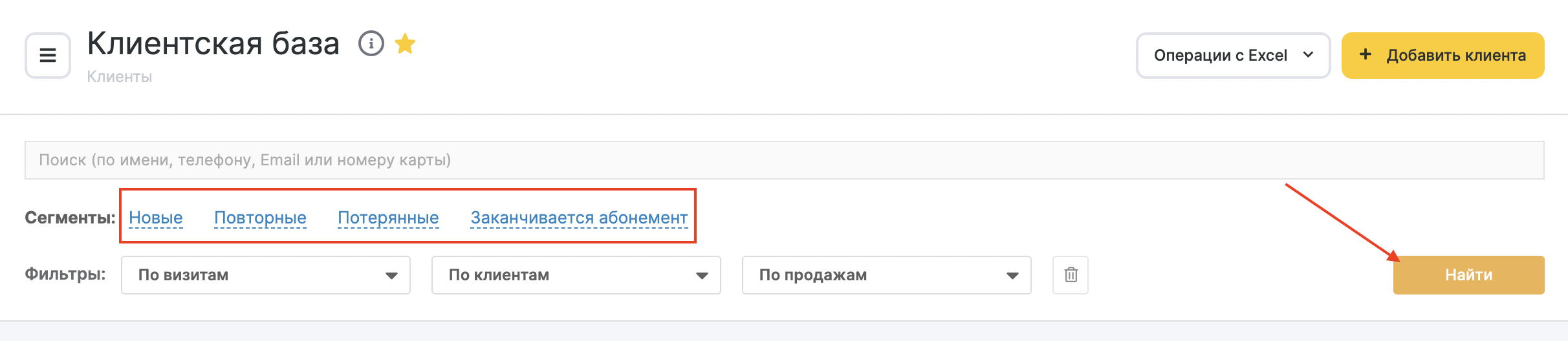 Можно получить список клиентов подходящий под конкретные условия. Для этого используйте фильтры. Как с ними работать, читайте в статье.