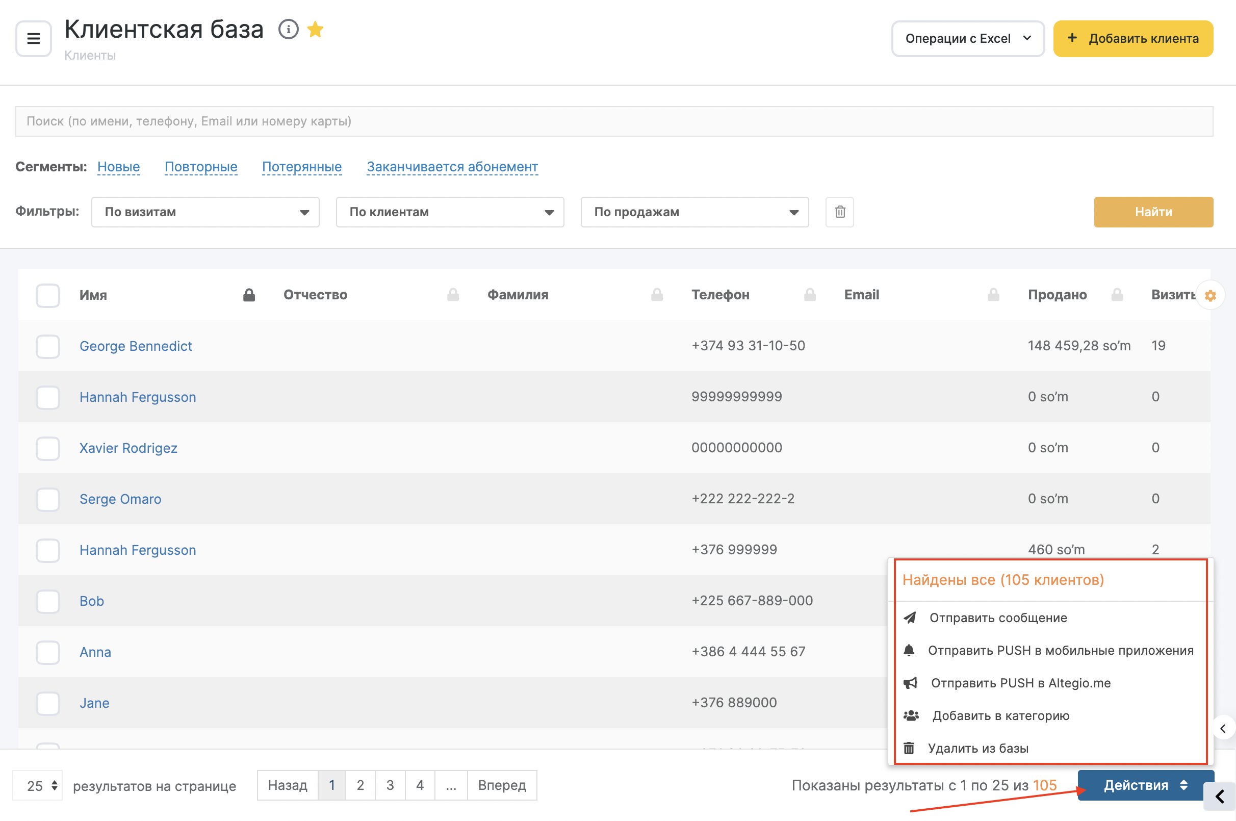Вы можете совершать массовые рассылки клиентам, отправлять уведомления, удалять клиентов из базы, присваивать им категории, выгружать информацию в Excel.Чтобы сделать действие на всех клиентов, достаточно просто нажать «Действия» и выбрать соответствующий пункт из списка.