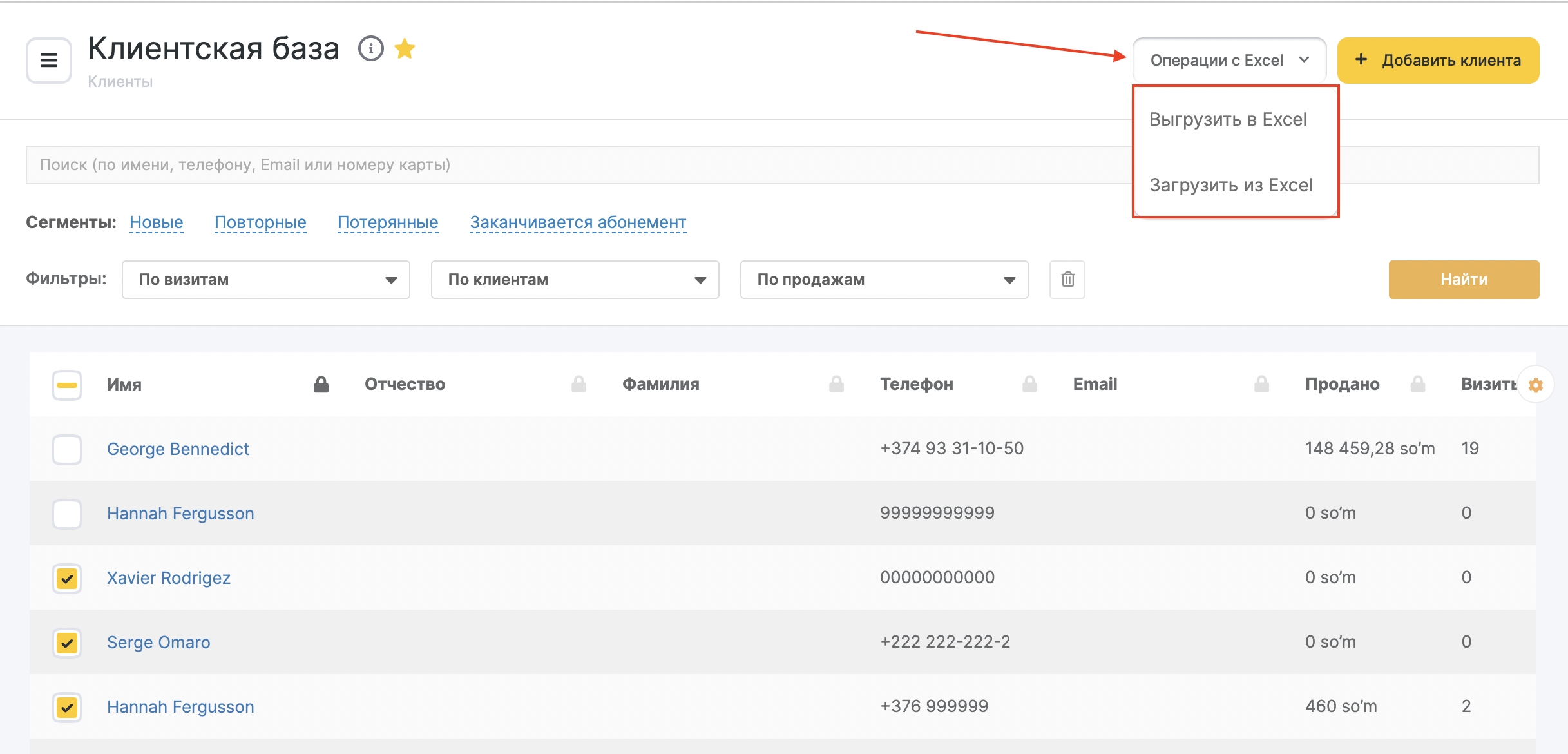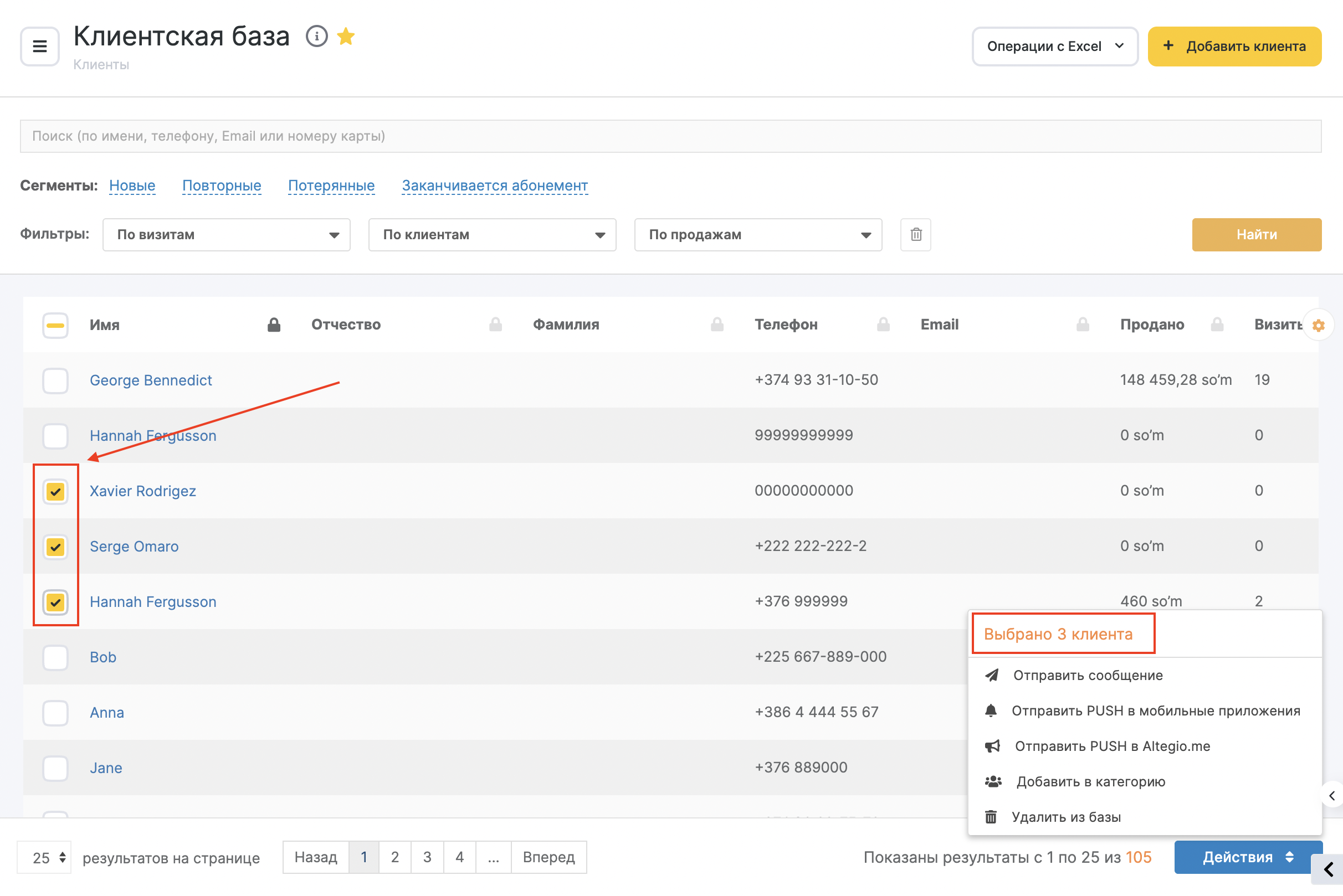 Действия можно совершать либо со всеми найденными в базе клиентами, либо только с выбранными. Чтобы выбрать клиента, поставьте галочку напротив его имени, после этого действия будут совершены только для выбранных клиентов.