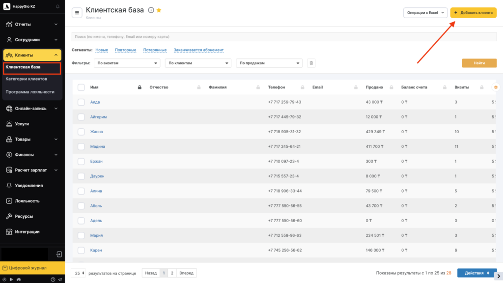 В разделе Клиенты > Клиентская база вы можете добавить нового клиента вручную или загрузить список клиентов из таблицы Excel (подробнее об этом читайте здесь).