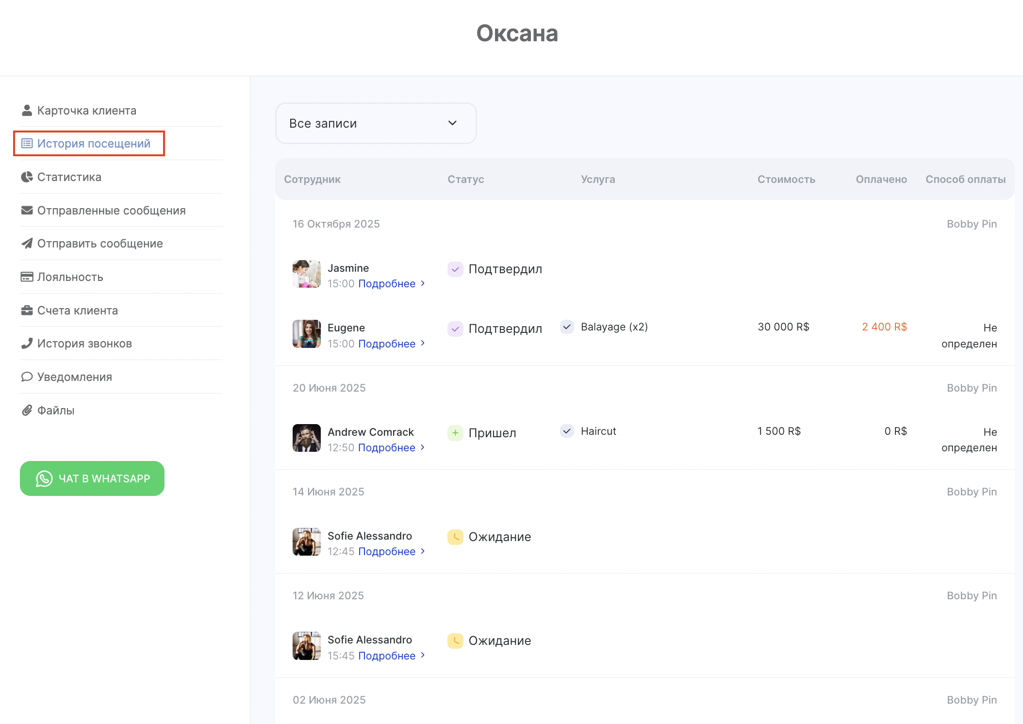 В этом разделе указываются все записи клиента, сотрудники, к которым он записывался, услуги, которые были ему предоставлены, приобретенные товары, скидки, оплаченные суммы и оставленные чаевые, комментарии к записи, а также указываются филиалы, которые посещал клиент.Из «Истории посещений» можно перейти в визит, для этого нужно нажать на кнопку «Подробнее».