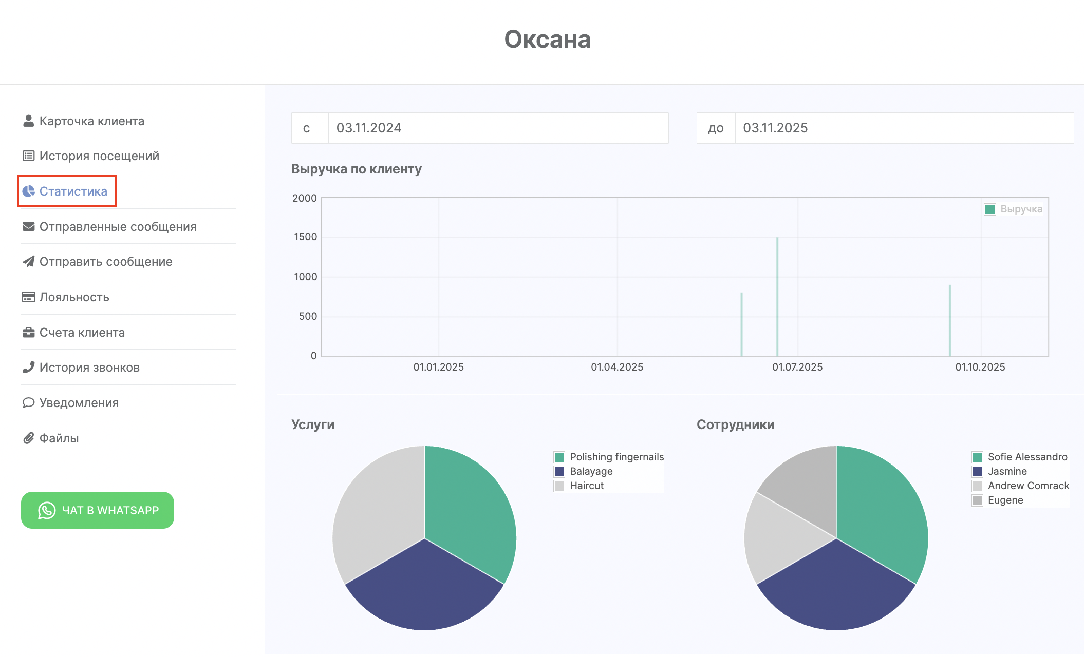 В этом разделе отображаются данные о выручке по клиенту и его предпочтения за выбранный период.
