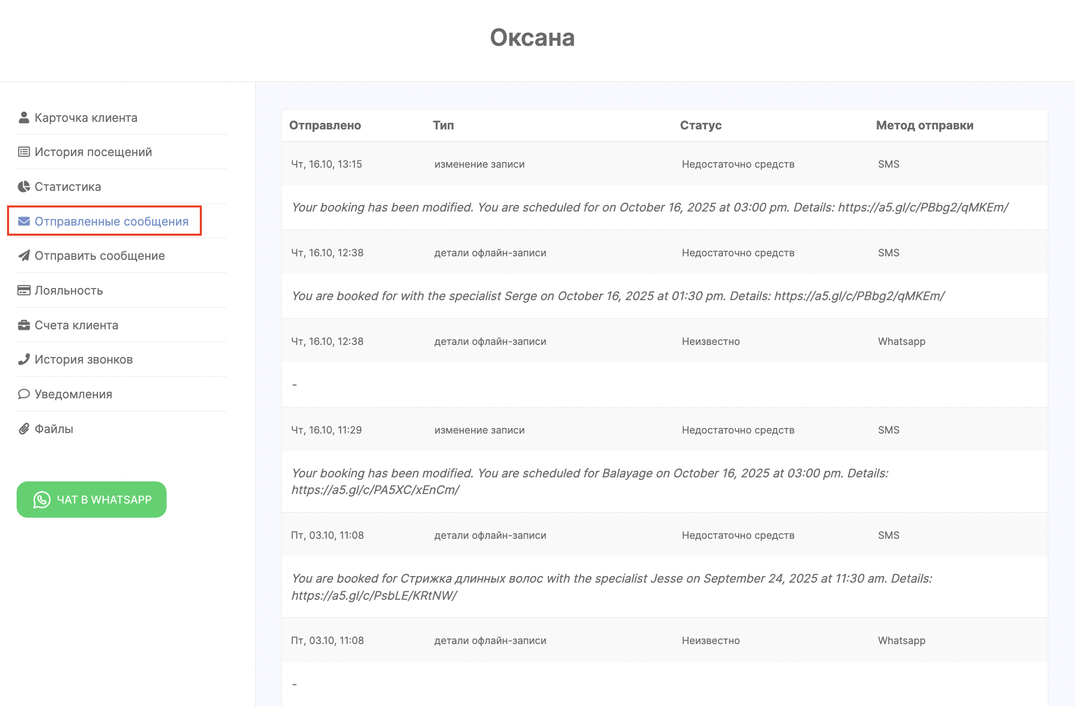 В этом разделе отображается список сообщений, отправленных клиенту по всем каналам. Здесь также отображается их тип, статус, время отправки, содержание сообщения и канал.