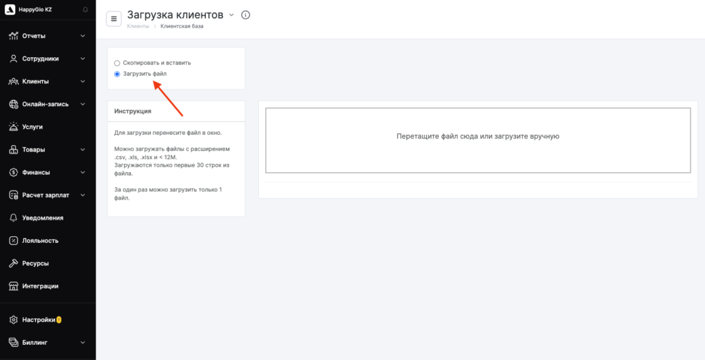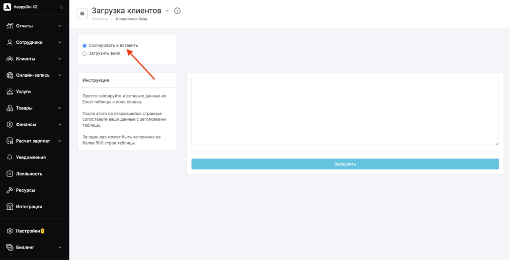 - Загрузите данные. Это можно сделать двумя способами — скопировать данные из таблицы Excel и вставить в окно загрузки в Altegio, либо просто перенести файл из папки.