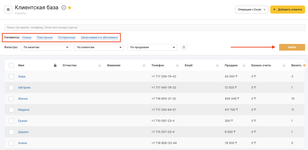 Отфильтруйте информацию о клиентах по необходимым пунктам, нажмите кнопку Найти.