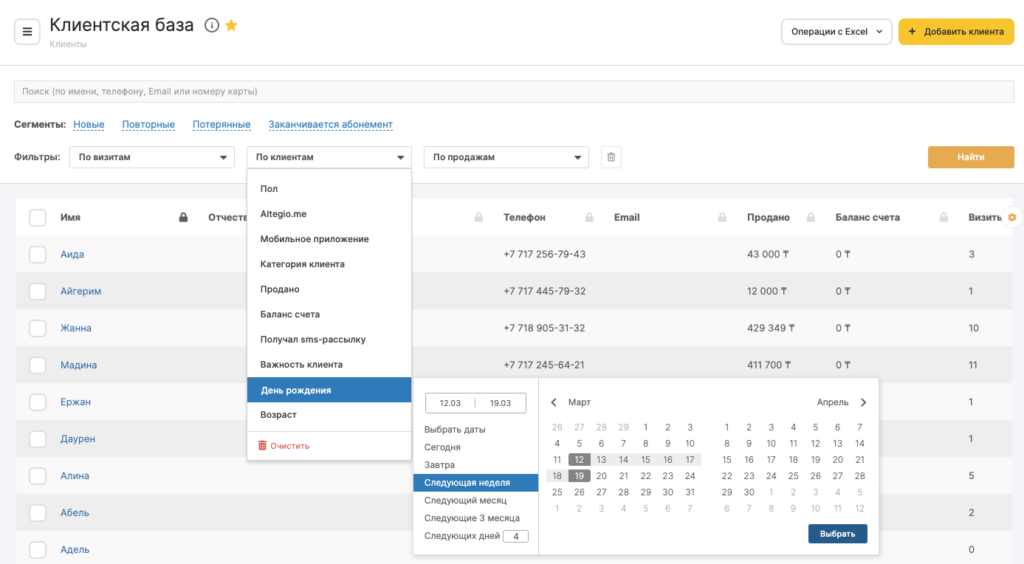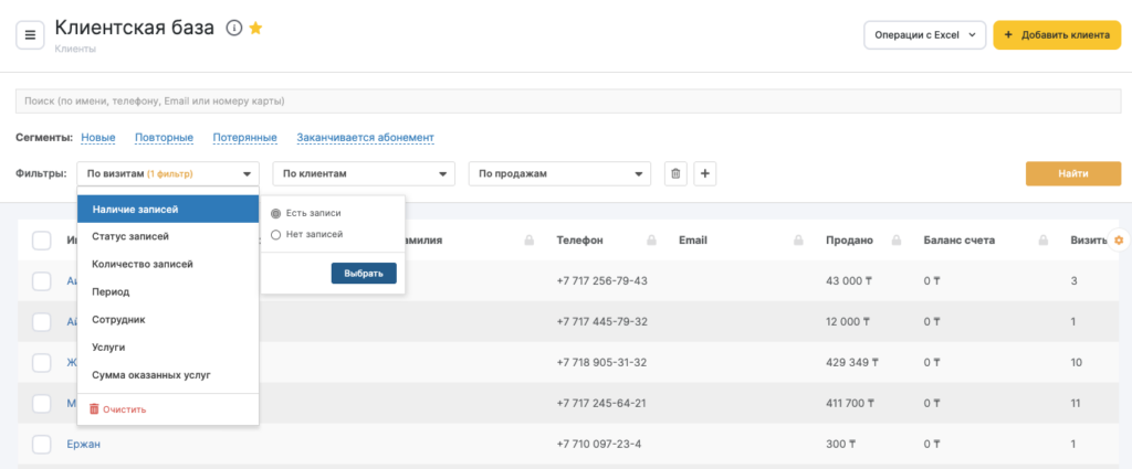 Для сегментации клиентов в разделе Клиенты > Клиентская база (режим Администрирование) предусмотрен ряд фильтров. Вы можете сформировать список клиентов, для которых можно создать SMS-рассылку (при наличии подключенного SMS-агрегатора) или присвоить им определенную категорию.
