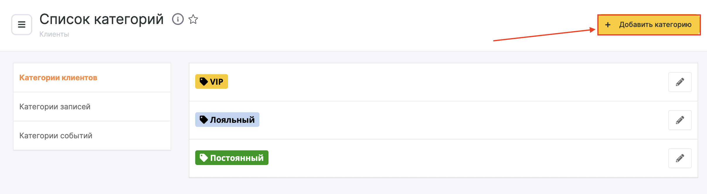 В Altegio предусмотрено распределение клиентов по категориям. «Категории» представляют собой цветные метки с названиями, они позволяют отмечать и выделять отдельных клиентов или группы клиентов по различным критериям. По умолчанию создано 3 категории: «Постоянный», «Лояльный», «VIP».