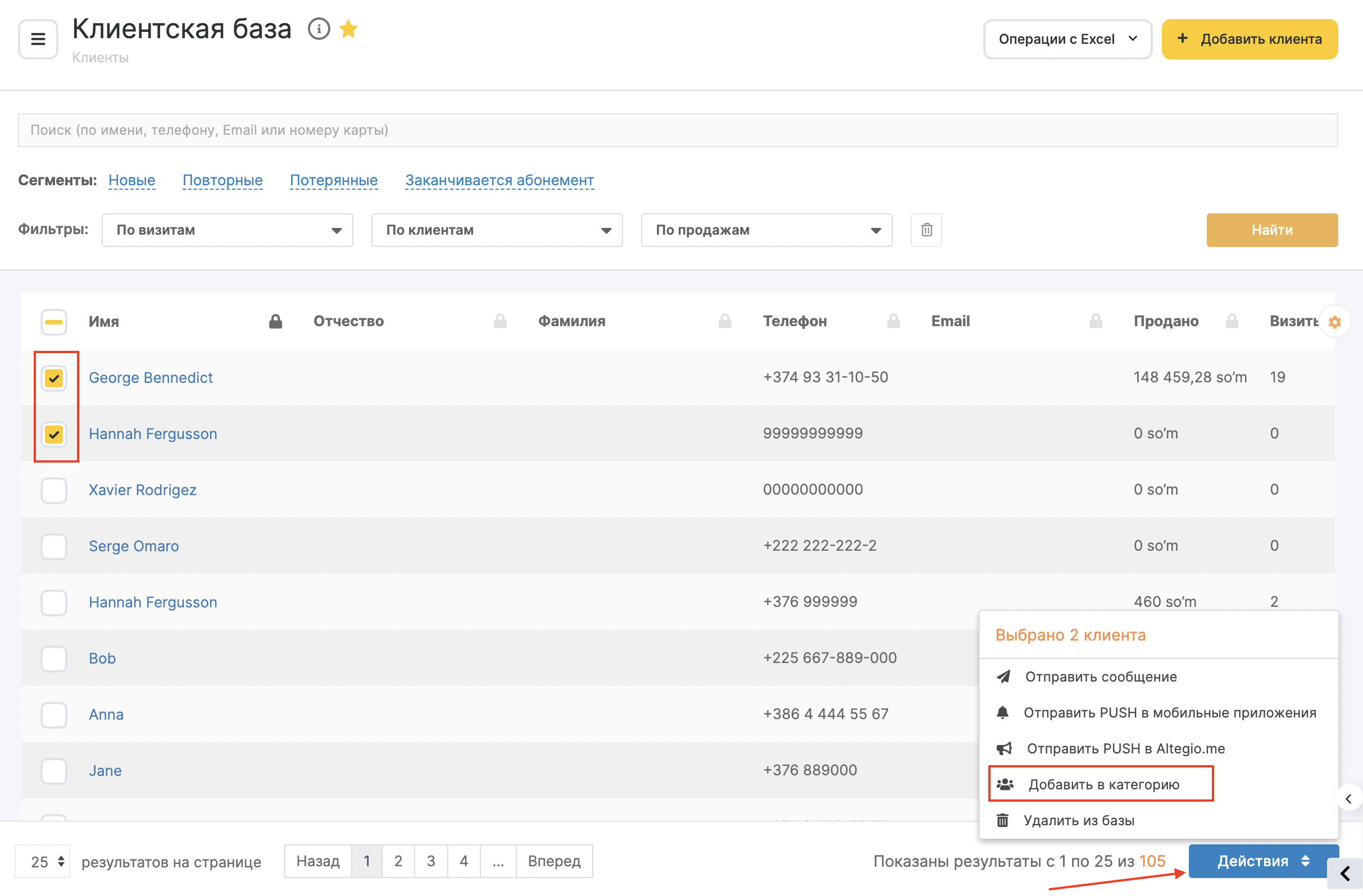 Если в категорию нужно добавить только часть клиентов, в списке выберите клиентов (поставьте галочки напротив их имен), нажмите кнопку «Действия» и выберите пункт «Добавить в категорию».