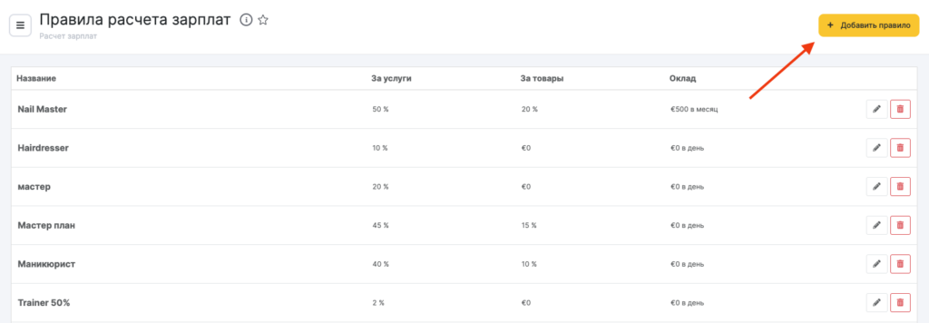 Перейдите в раздел Расчет зарплат > Правила расчета, нажмите кнопку Добавить правило и укажите Название правила, например «Правило расчета для nail-мастеров».