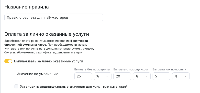 - Если за выполнение отдельных услуг сотруднику нужно назначить иной процент, включите опцию Установить индивидуальные значения для услуг или категорий.