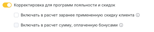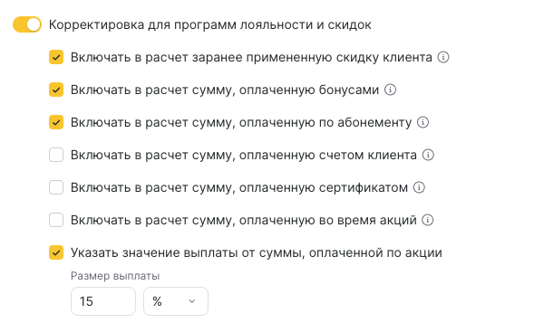 - Если включить корректировку, в расчёт заработной платы будет использоваться полная стоимость товара, без уменьшения на скидки клиента, оплату бонусами, сертификатами, акциями или абонементами.