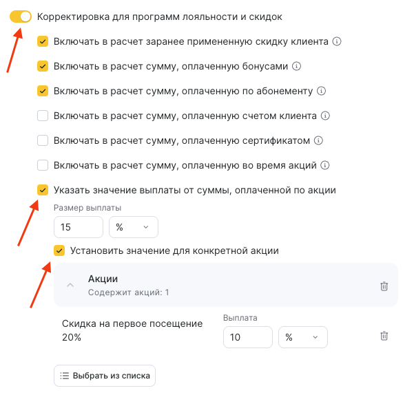Этот блок позволяет настроить, какие суммы должны учитываться при расчёте вознаграждения сотрудника, если клиент использует скидки, бонусы, абонементы или участвует в акциях.