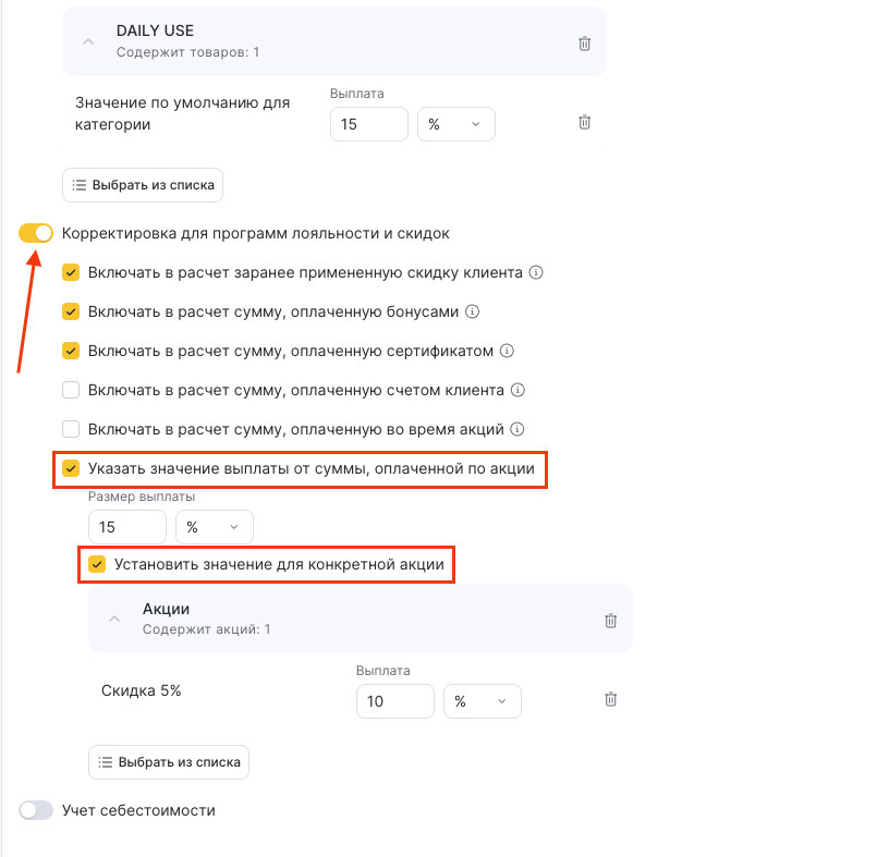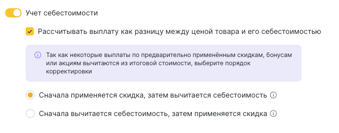 Активируйте опцию Учет себестоимости, чтобы выплата рассчитывалась от цены товара за вычетом себестоимости.