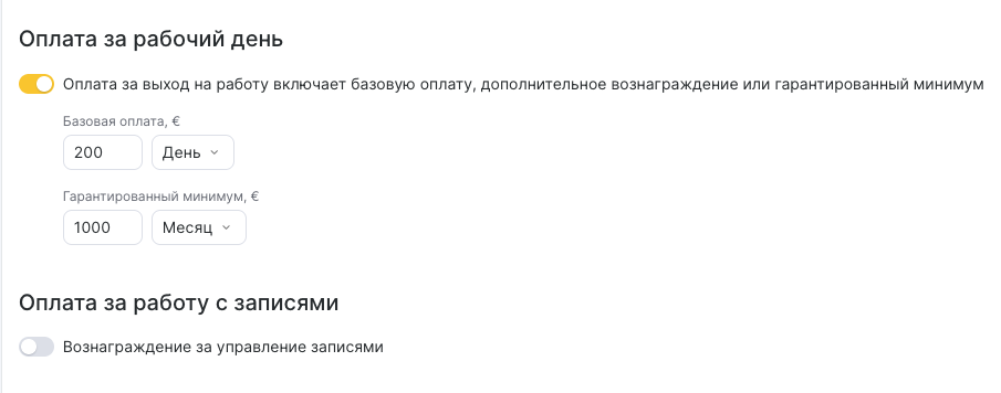 - Активируйте опцию Оплата за выход на работу включает базовую оплату, дополнительное вознаграждение или гарантированный минимум.