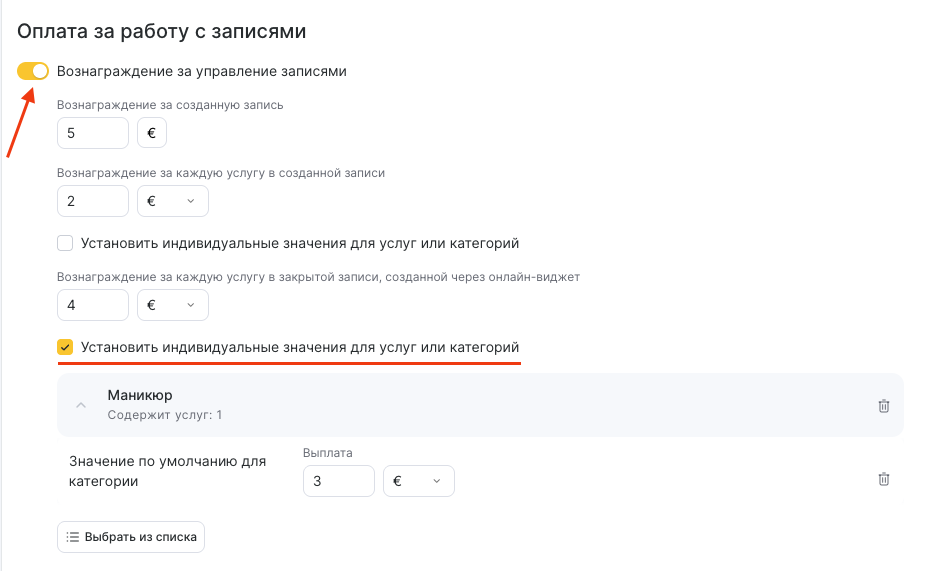 - Установите индивидуальные значения для разных услуг или категорий. Для выбора категорий или услуг нажмите кнопку Выбрать из списка.