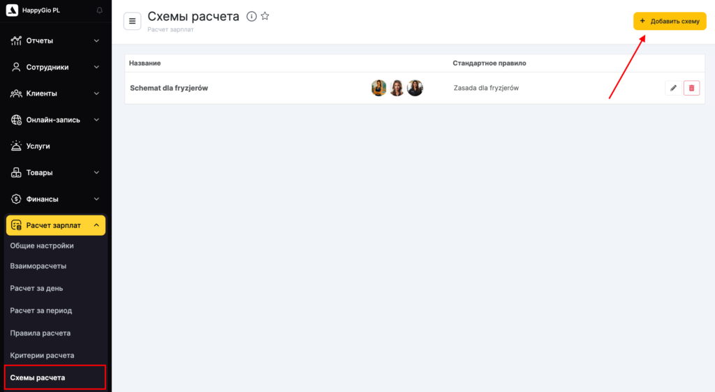 Перейдите в режим Администрирование в раздел Расчет зарплат > Схемы расчета. Здесь будут отображаться все созданные схемы, их можно редактировать и удалять. Для создания новой схемы нажмите кнопку Добавить схему.