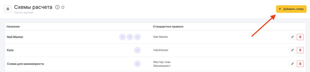 - Перейдите в раздел Расчет зарплат > Схемы расчета.