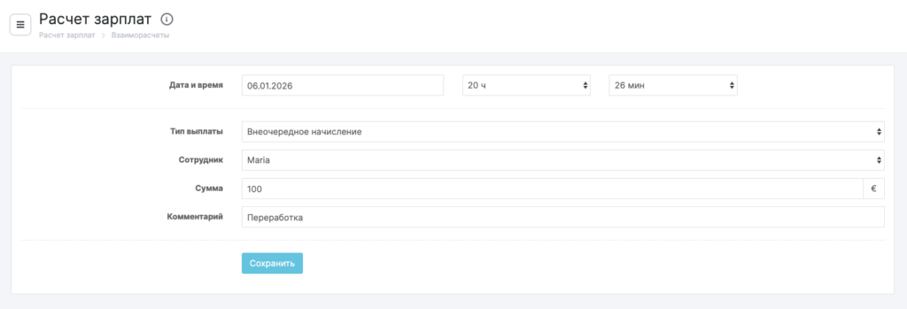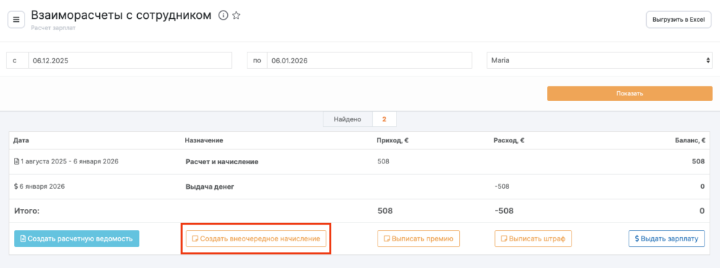 Перейдите в раздел Расчет зарплат > Взаиморасчеты, выберите период и сотрудника, которому нужно начислить выплату, и нажмите кнопку Создать внеочередное начисление.