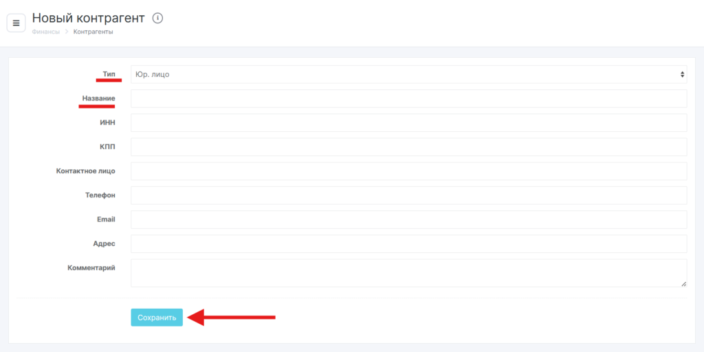 Обязательными для заполнения являются поля Название и Тип контрагента.