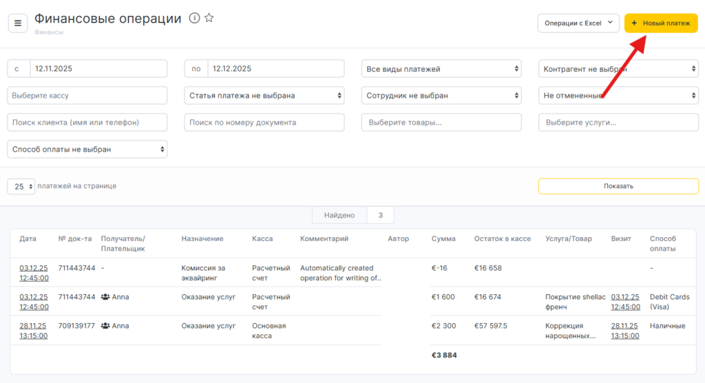 Чтобы создать новую финансовую операцию, нажмите на жёлтую кнопку Новый платёж в правом верхнем углу.