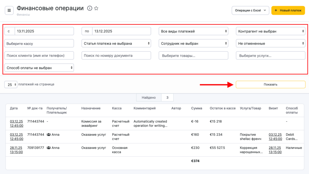 - Для формирования отчета перейдите в раздел Финансы > Финансовые операции.