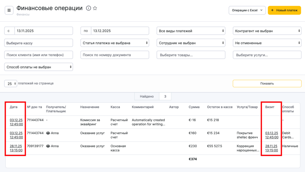 - Данные в столбцах Дата и Визит представлены в виде кликабельных ссылок. Нажмите на ссылку в столбце Дата, чтобы перейти на страницу с деталями выбранной операции. Нажмите на ссылку в столбце Визит, чтобы перейти в окно визита.