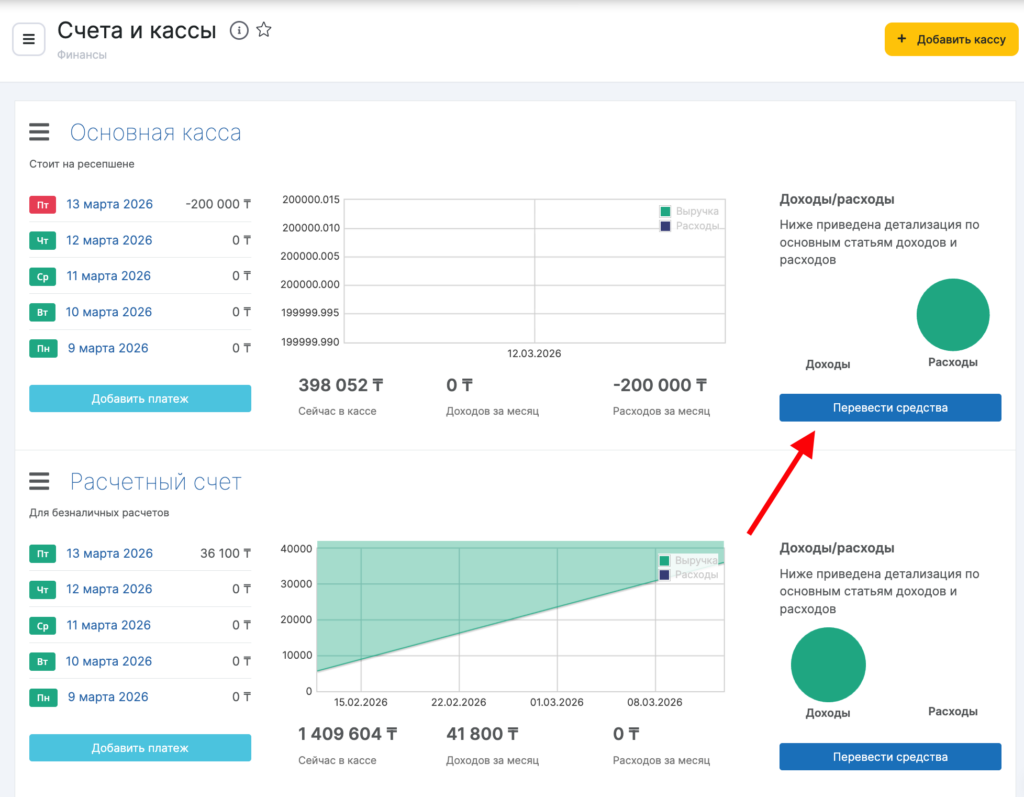 - Нажмите кнопку Перевести средства в разделе Финансы > Счета и кассы (режим Администрирование).