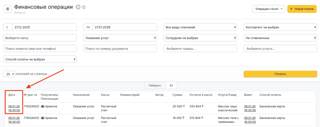 Чтобы удалить финансовую транзакцию, в разделе Финансы > Финансовые операции откройте нужную транзакцию, нажав на дату ее проведения, и затем нажмите кнопку Отменить. Подтвердите удаление во всплывающем окне.