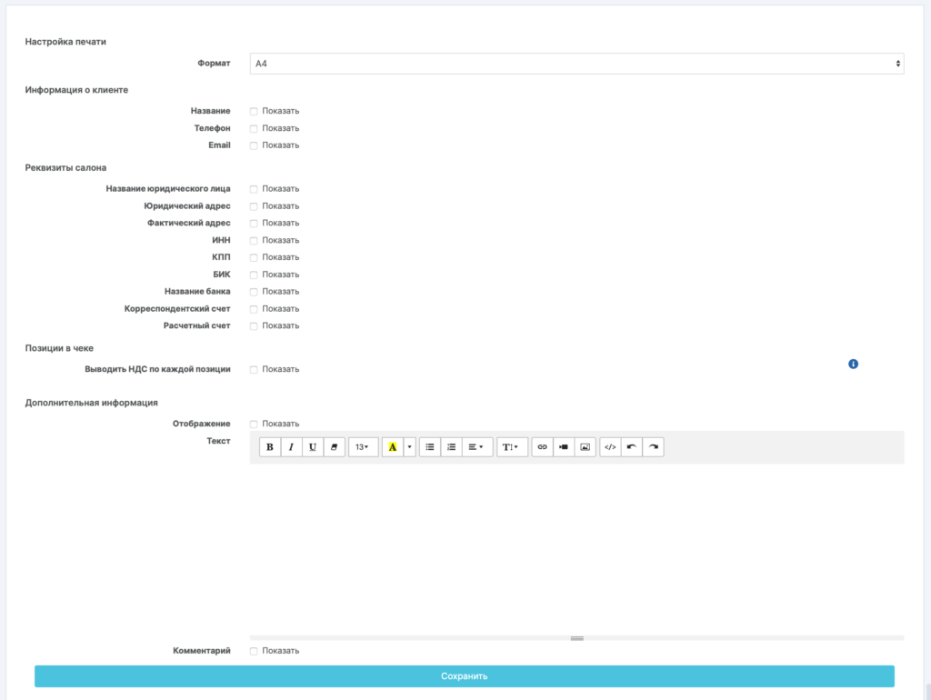 Вы можете настроить размер нефискального чека (А4, терминальный принтер 80 мм или 58 мм), а также отображение следующей информации: