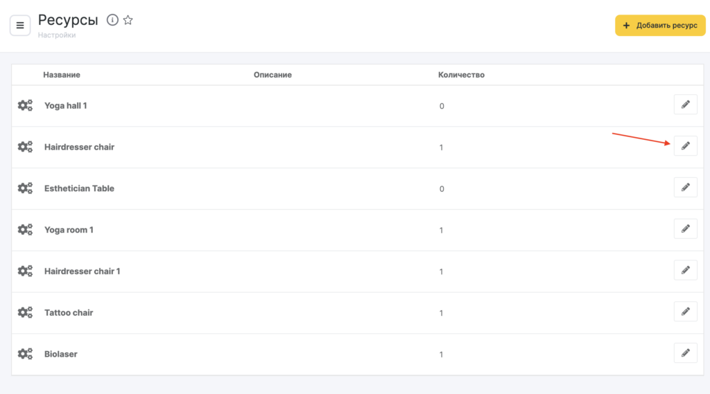 - Откроется список услуг, нажмите на название услуги, к которой нужно прикрепить ресурс, или на кнопку редактирования услуги.