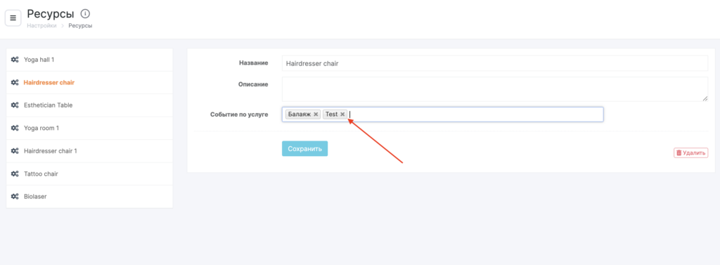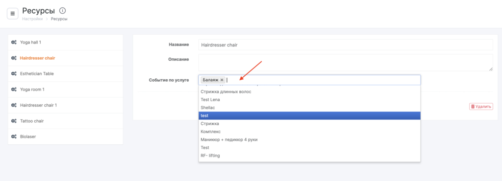 Прикрепление услуг через настройки ресурсов #