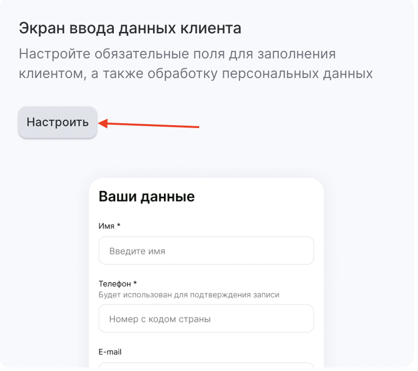 И нажмите на кнопку Настроить в блоке Экран ввода данных клиента.