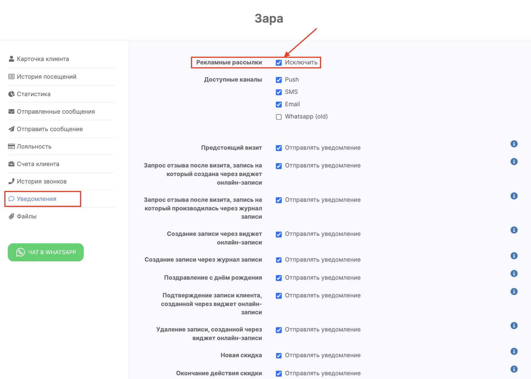 Самый простой и удобный способ для исключения клиента из SMS-рассылки — установить соответствующую настройку в его карточке в разделе «Клиенты» > «Клиентская база»: