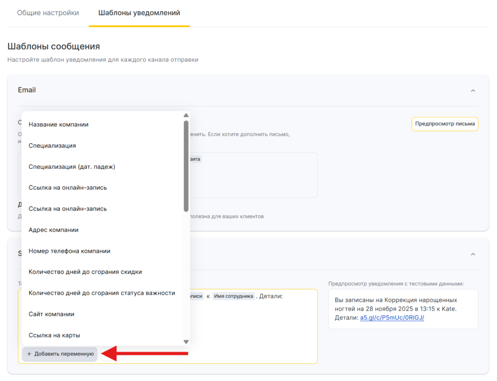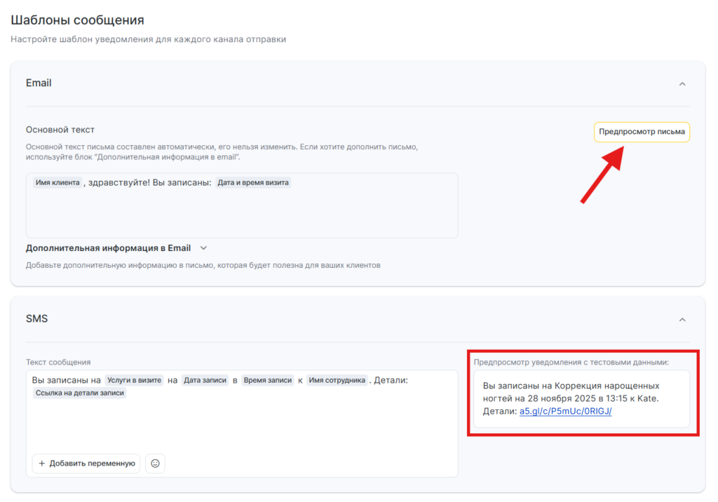 Для всех шаблонов уведомлений доступен предпросмотр — как будет выглядеть сообщение при отправке клиенту, сотруднику или администратору, с учетом переменных.