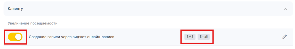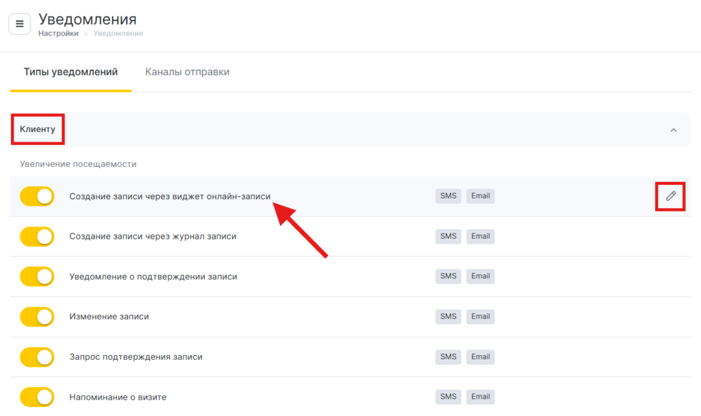 - В блоке Клиенту выберите тип Создание записи через виджет онлайн-записи. Чтобы перейти к редактированию условий, сценариев отправки и шаблонов, нажмите на название уведомления или иконку карандаша.